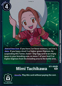 Main If you have a level 5 or higher green Digimon in play, you can suspend this Tamer to hatch 1 Digi-Egg card to an empty space in your breeding area, or move 1 level 3 or higher Digimon from your breeding area to your battle area.