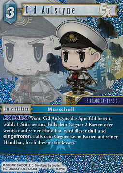 EX BURST Wenn Cid Aulstyne das Spielfeld betritt, wähle 1 Stürmer aus. Falls dein Gegner 2 Karten oder weniger auf seiner Hand hat, wird dieser dull und eingefroren. Falls dein Gegner keine Karten auf seiner Hand hat, brich diesen stattdessen.