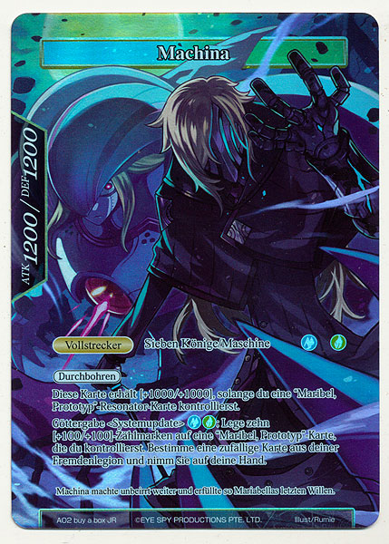 Immer wenn eine Wasser-Insignie unter deiner Kontrolle auf das Spielfeld gelegt wird ⇒ Wähle einen Effekt. Falls die Insignie "Maribel, Prototyp" ist, kannst du stattdessen bis zu zwei wählen - Bestimme eine zufällige Karte aus deiner Fremdenlegion und nimm sie auf deine Hand; oder lege zwei 200/200 WASSER-Maschine-Resonator-Spielmarken auf das Spielfeld; oder lege fünf +100/+100-Zählmarken auf eine "Maribel, Prototyp"-Karte, die du kontrollierst; oder du kannst bis zum Ende des Spielzugs