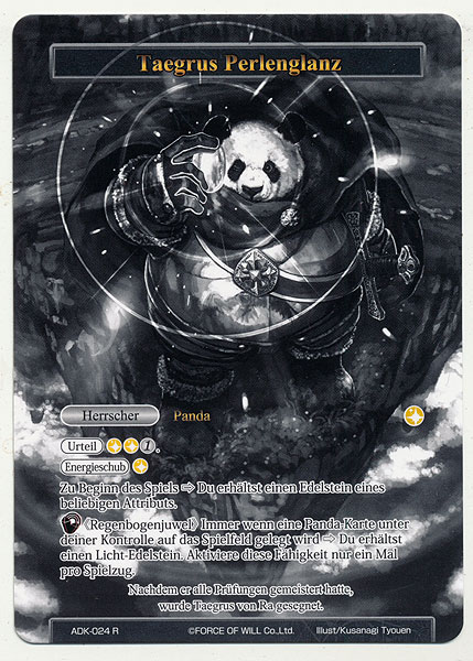 ?Regenbogenjuwel? Immer wenn eine Panda-Karte unter deiner Kontrolle auf das Spielfeld gelDu erhältst einen Licht-Edelstein. Aktiviere diese Fähigkeit nur ein Mal pro Spielzug.