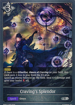 [Quick] If there is a Gilnelise, Omen of Craving on your field, this card costs 3 less to play from the EX area. Select an enemy follower on the field. Deal it 4 damage and give your leader [Defense]+1.